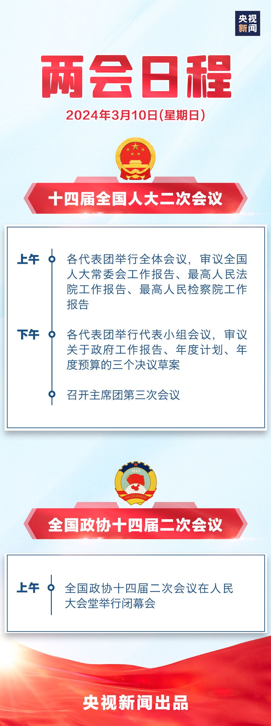 两会日程预告丨3月10日:十四届全国人大二次会议举行全体会议 全国政协十四届二次会议闭幕