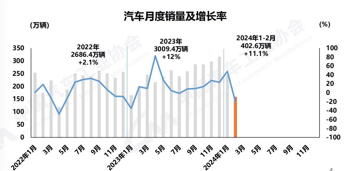1-2月,汽车产销分别完成391.9万辆和402.6万辆,同比分别增长8.1%和11.1%。