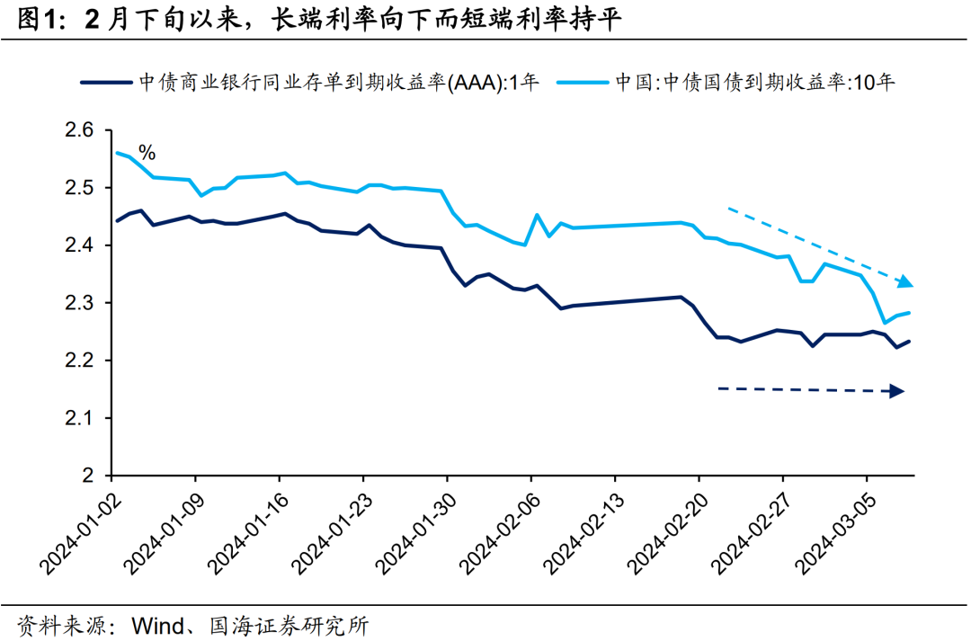 2月下旬以来债市表现整体偏强,其中中长端利率下行幅度较大,3月6日10Y国债利率一度下探至2003年以来新低。然而在短端,以1Y同业存单为代表的短债利率却并未显著下行,而是呈现窄幅震荡的态势(图1)。