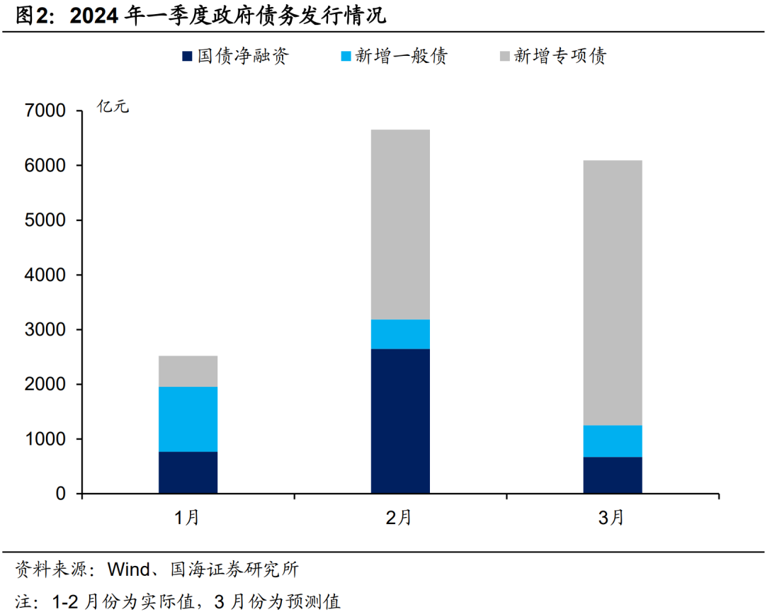 在2024年1月14日报告《一季度,利率债供给如何?》中,我们曾预测过一季度国债、地方债、政金债发行情况。其中,国债、地方债发行由于资金需要暂时汇缴央行国库,“发行-下拨”时间差对资金面形成扰动。我们估算,3月份国债净融资为672亿元,新增地方债为5423亿元(测算过程详情1月14日报告),政府债务净融资环比较2月份减少558亿元(图2)。