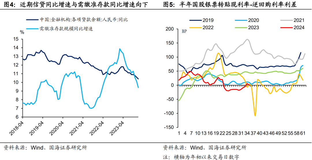 不过从票据利率上来看,尽管2024年2月份5年期LPR下调,但此后票据利率上行幅度相对温和,并弱于往年季节性(图5)。我们认为或预示着近期信贷投放形势一般,信贷同比增速回升可能性不大。