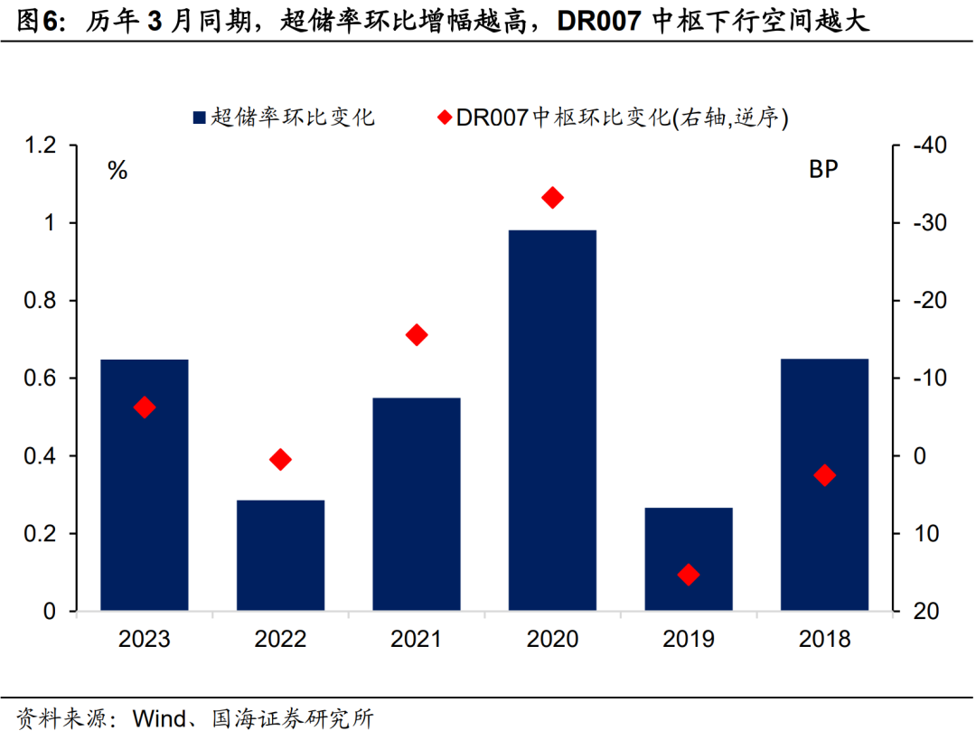 这部分资金需求不易测算,然而我们可以通过对比历史同期,判断资金面走向。对比历史同期,2024年3月超储率增幅,或高于2022年同期,低于2021年、2023年同期(图6)。