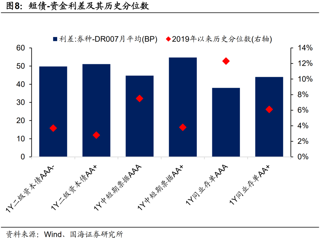 截至3月8日,主流短债品种“利率-资金利率中枢”利差,多位于2019年以来历史分位数的10%左右或以下,利差保护较低。因此短债市场可能会继续维持震荡态势。同时需要防范3月末跨季资金受“资本新规”影响超预期波动,对债市带来的扰动。