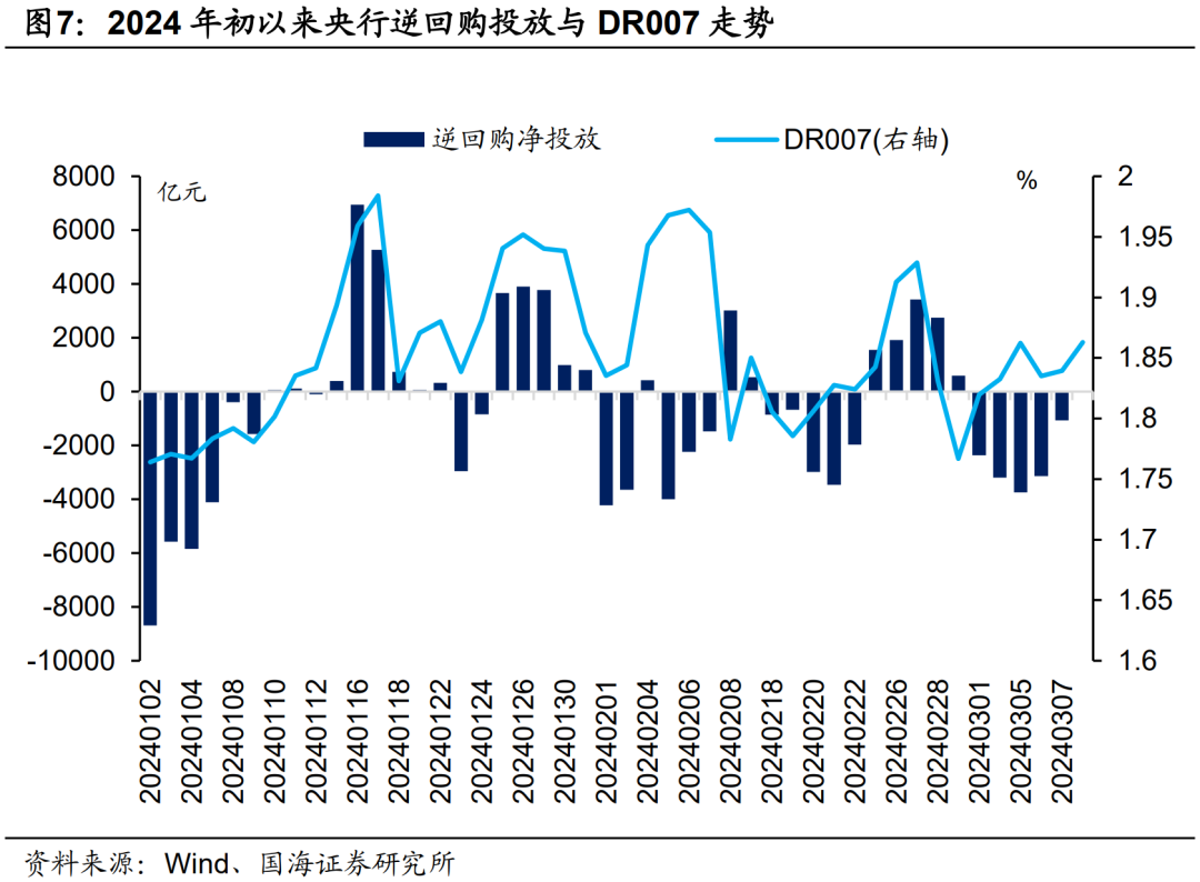 尽管3月份资金面利多存在因素,不过我们仍需考虑央行对于资金面的调控。根据2024年初以来央行的逆回购投放节奏,我们观察到,当DR007低于1.8%时,央行倾向于回笼逆回购,以维持DR007在逆回购利率以上。在央行的调控下,我们认为3月份资金利率向下有底,利率中枢大幅下穿1.8%的可能性不大。