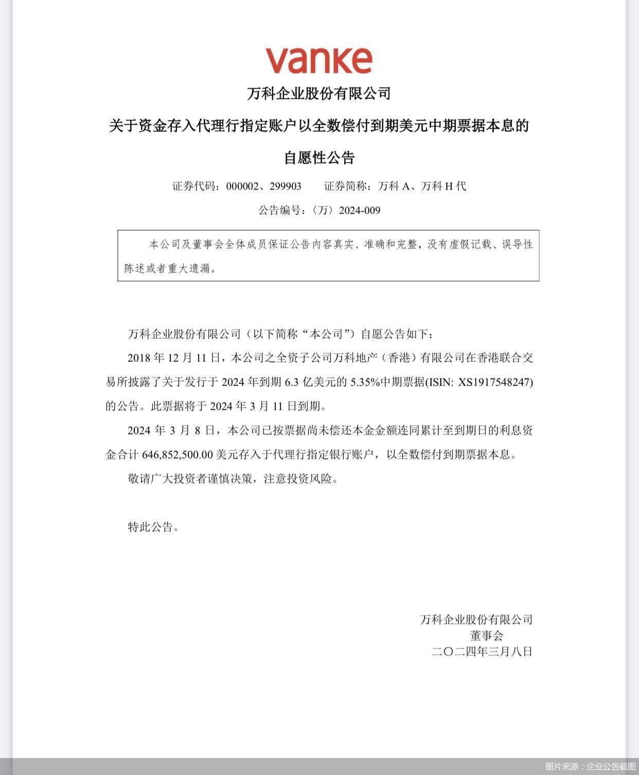 3月8日,万科的一则公告引起了市场的广泛关注。公告显示,万科已按票据尚未偿还本金金额连同累计至到期日的利息资金合计6.47亿美元存入于代理行指定银行账户,全数偿付到期票据本息。