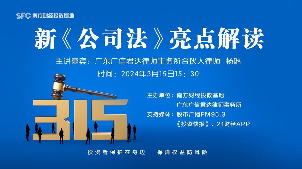 新修订的《公司法》将于2024年7月1日起施行,为进一步普及新《公司法》知识,增强中小股东的自我保护能力,引导公司、中小股东更好知法、懂法、守法,南方财经投教基地近期将围绕新《公司法》推出专题讲座,邀请到广东广信君达律师事务所合伙人杨琳律师,就新修订的《公司法》进行亮点解读。