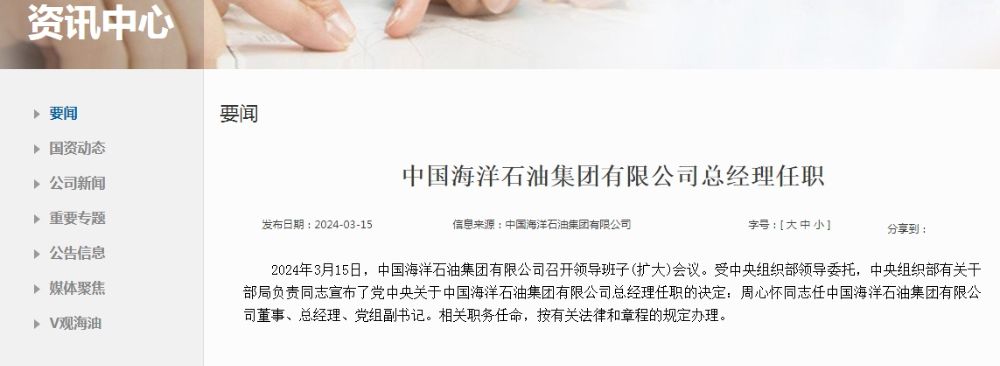 3月15日,中国海洋石油集团有限公司召开领导班子(扩大)会议。受中央组织部领导委托,中央组织部有关干部局负责同志宣布了党中央关于中国海洋石油集团有限公司总经理任职的决定:周心怀同志任中国海洋石油集团有限公司董事、总经理、党组副书记。相关职务任命,按有关法律和章程的规定办理。