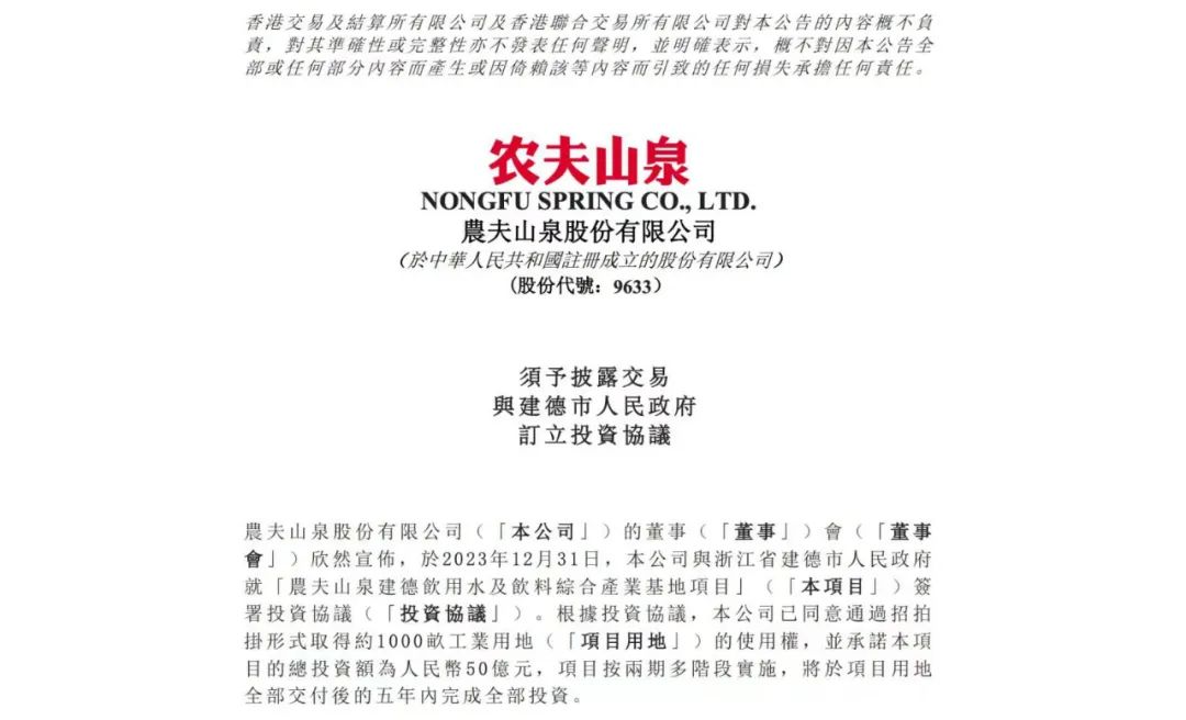 去年最后一天,他与浙江省建德市签署50亿元投资项目协议,计划拿地1000亩,建设农夫山泉“饮用水及饮料综合产业基地”,项目用地交付后的五年内完成投资。