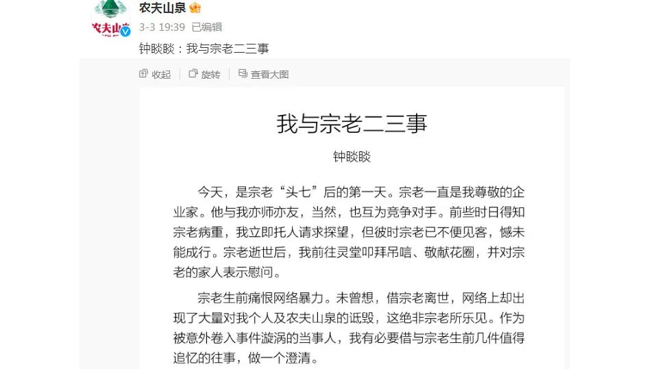 3月3日晚,钟睒睒在农夫山泉微信公众号发布《我与宗老二三事》一文,回应争议。