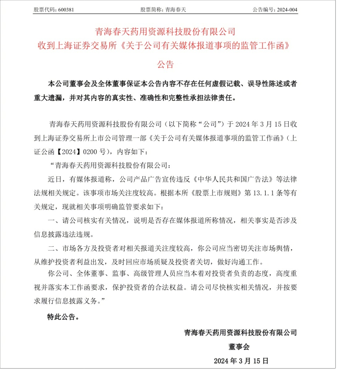 随后,青海春天发布公告称,收到上交所《关于公司有关媒体报道事项的监管工作函》。