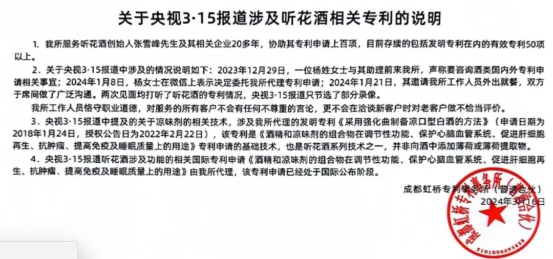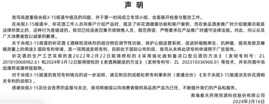 针对上述曝光内容,青海春天官网发布声明称,高度重视央视“3·15晚会”报道中提及的问题,并于第一时间成立专项小组,全面展开检查与整改工作。声明称,听花酒工作人员向客户介绍产品时,提及了听花酒健康功能和客户案例,而在食品酒类推广时介绍健康功能是法律所禁止的,这种行为是错误的,该公司已经连夜召集市场销售人员,规范用语,严格要求在产品推广时遵守法律法规。此外,声明指出,报道所涉专利处于国际公布阶段,该公司从未用于广告宣传。