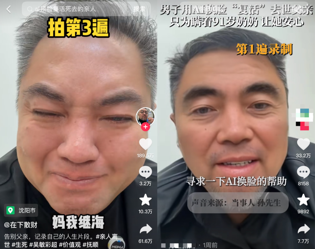 这类“AI复活”的视频片段在短视频平台播放量很高,一般是小辈为家里的老人下订单,找人用逝者的脸和声音与老人通话,对老人谎称逝者在外工作,将“善意的谎言”继续,老人一般也看不出异样,只是频频抹泪。