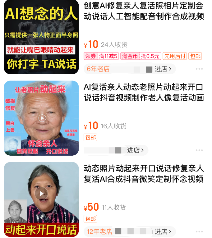 电商平台上,有不少店铺提供“AI复活”服务,让照片说话的标价多为10元、50元。短视频平台上,也有不少人以“AI造梦”“AI疗愈”的名义提供类似服务。“收费便宜、效果粗糙,但这是一个长期存在的长尾市场。”董慧智称。