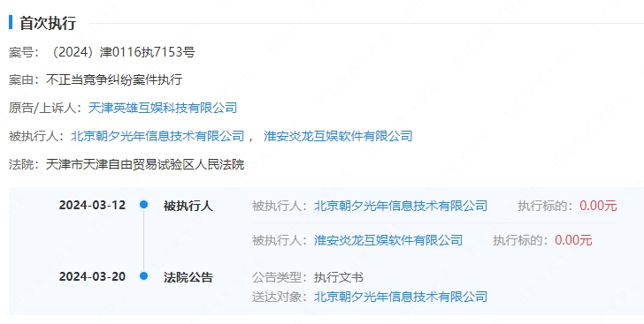 企查查显示,3月20日,因淮安炎龙互娱软件有限公司、北京朝夕光年信息技术有限公司未履行声明义务,原告天津英雄互娱科技有限公司申请执行,天津市滨海新区人民法院公告双方不正当竞争纠纷案件判决主要内容。公告显示,二被告因其不正当竞争行为给原告造成不良影响,应承担侵权责任。判决内容之一为:两被告共同在《代号:Spark》游戏于TapTap、好游快爆平台的游戏宣传主页连续48小时刊登声明,消除影响。如不履行,法院将在相关媒体上公布判决主要内容,所需费用由两被告承担。