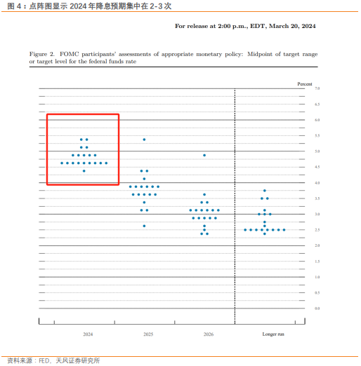 而此前预期的点阵图修正并未出现,2024 年仍然是 3 次降息预期,而 2025、2026 年则分别下调了 1 次降息预期。2024 年的降息预期十分胶着,9位委员支持降息两次或更少,9位委员支持降息三次,1位委员支持降息四次。