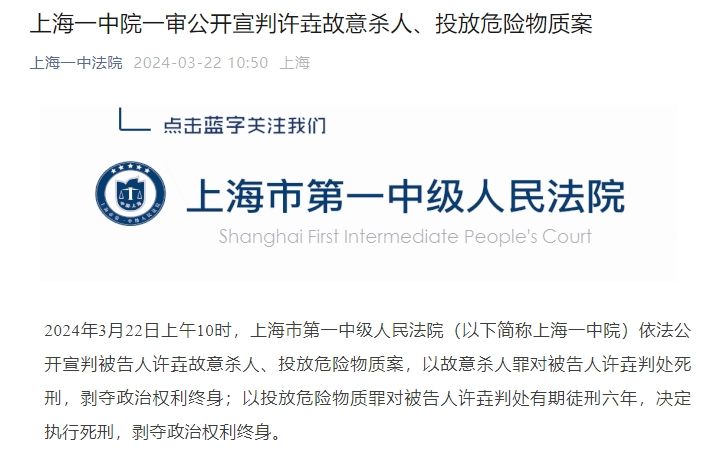 据上海一中法院微信公众号消息,2024年3月22日上午10时,上海市第一中级人民法院(以下简称上海一中院)依法公开宣判被告人许垚故意杀人、投放危险物质案,以故意杀人罪对被告人许垚判处死刑,剥夺政治权利终身;以投放危险物质罪对被告人许垚判处有期徒刑六年,决定执行死刑,剥夺政治权利终身。