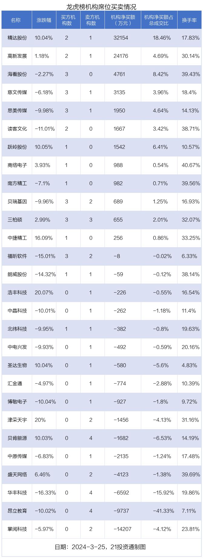 3月25日,28只个股龙虎榜出现了机构的身影,机构合计净买入2.93亿元。具体来看,机构净买入12股,净卖出16股。