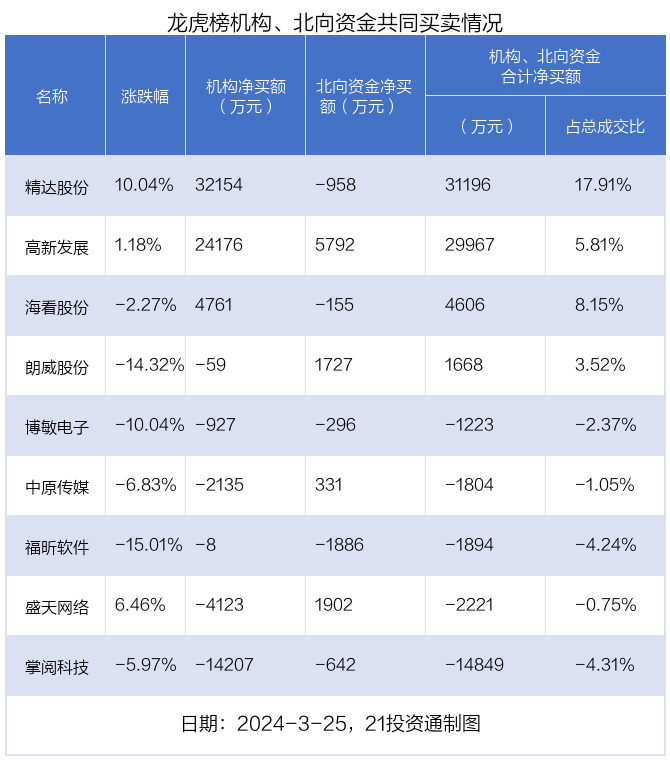 其中,机构净买入金额最多的是精达股份(600577.SH),当日收盘上涨10.04%,换手率为17.83%。