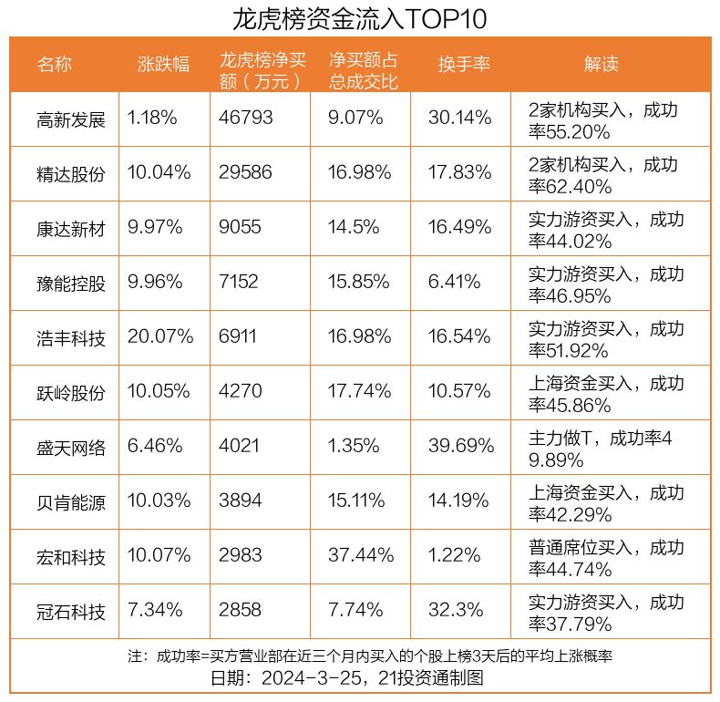 3月25日,上证指数下跌0.71%,深证成指下跌1.49%,创业板指下跌1.91%。盘后龙虎榜数据显示,共有48只个股因当日异动登上龙虎榜,资金净流入最多的是高新发展(000628.SZ),达4.68亿元。