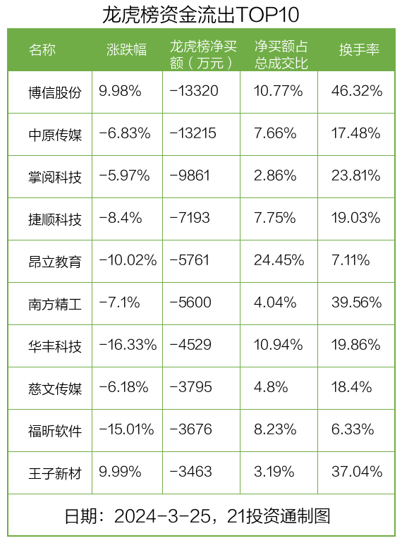 而龙虎榜中资金净流出最多的是博信股份(600083.SH),被净卖出为1.33亿元,占总成交金额的10.77%。博信股份收盘上涨9.98%,换手率为46.32%。