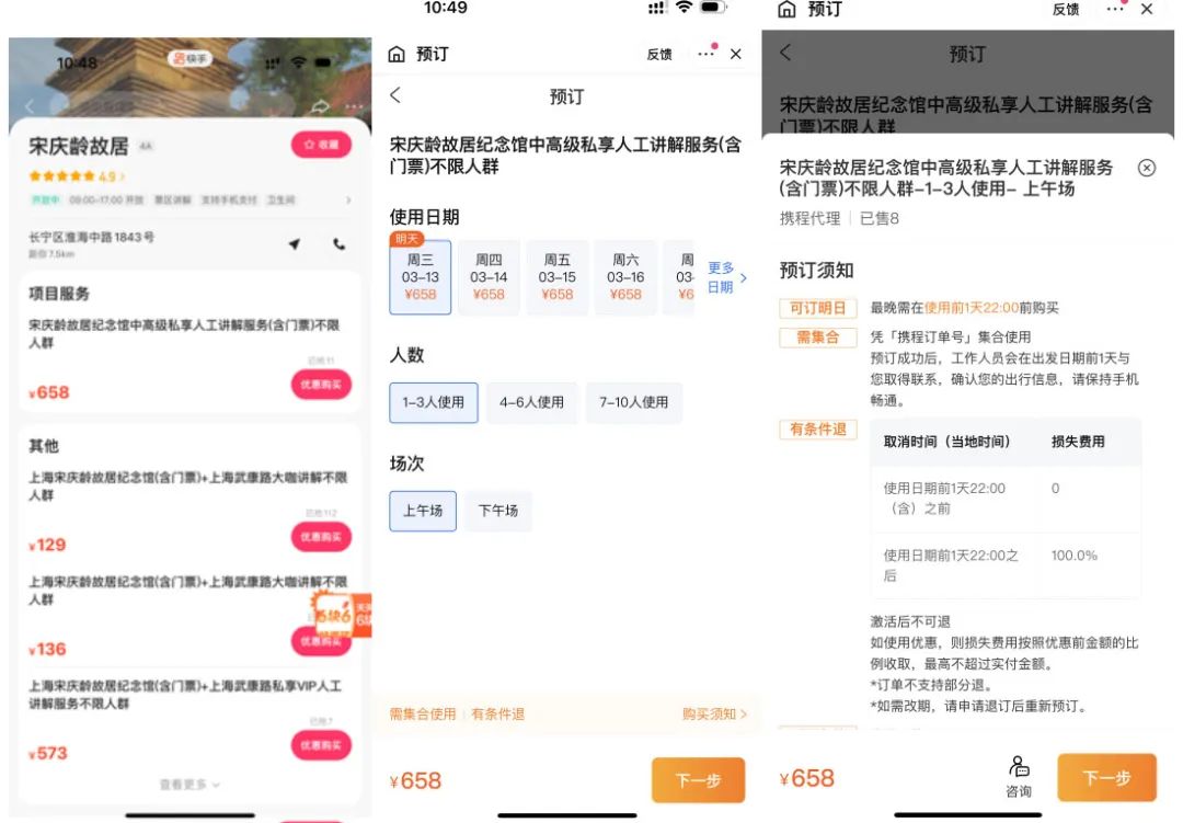 在快手,记者尝试购买由携程提供的“宋庆龄故居”门票,直接点击“购买”,便能进入预定界面,选择使用日期、人数、场次等,填写信息后付款即可,无需跳转至携程。