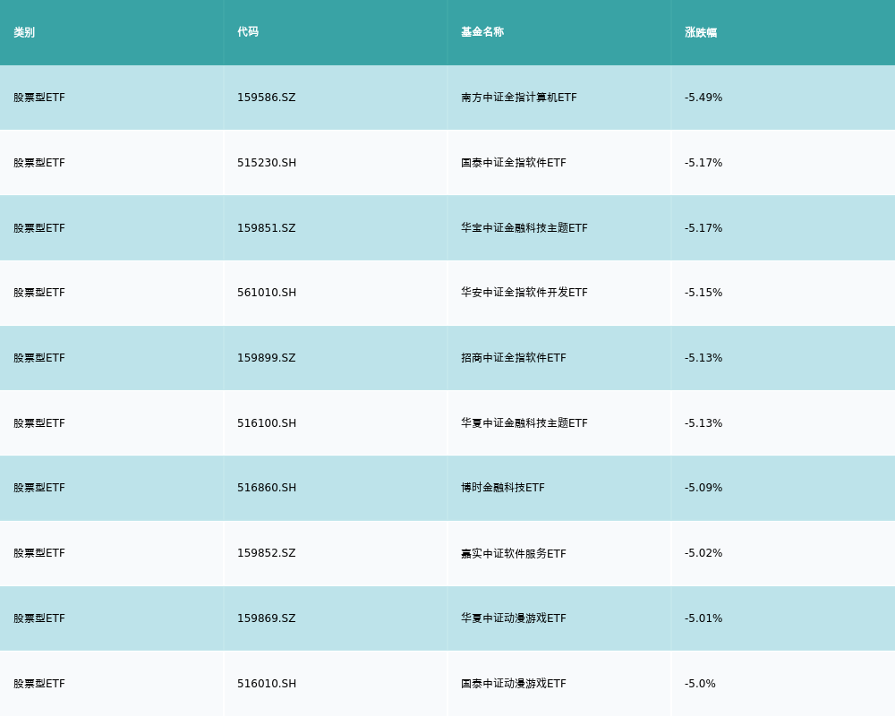 昨日股票型ETF跌幅最大的3支ETF及其收益率分别为:南方中证全指计算机ETF(-5.49%)、国泰中证全指软件ETF(-5.17%)、华宝中证金融科技主题ETF(-5.17%)。跌幅前10详情见下表: