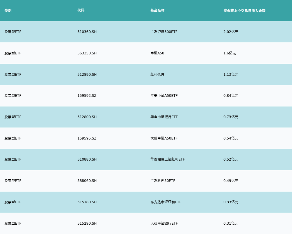 昨日股票型ETF资金流入最多的3支ETF及其流入金额分别为:广发沪深300ETF(流入2.02亿元)、中证A50(流入1.6亿元)、红利低波(流入1.13亿元)。资金流入前10详情见下表:
