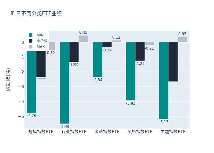 昨日股票型ETF收益率中位数为-1.92%。其中按照不同分类,规模指数中博时上证超大盘ETF收益率最高,为-0.52%;行业指数中富国中证800银行ETF收益率最高,为0.45%;策略指数中建信沪深300红利ETF收益率最高,为0.12%;风格指数中招商中证银行AH价格优选ETF收益率最高,为-0.21%;主题指数中黄金股ETF收益率最高,为0.35%。