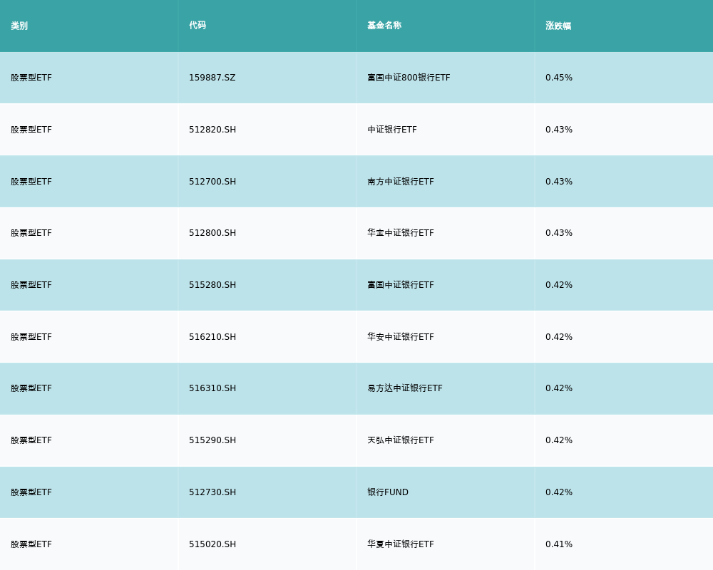昨日股票型ETF涨幅最高的3支ETF及其收益率分别为:富国中证800银行ETF(0.45%)、中证银行ETF(0.43%)、南方中证银行ETF(0.43%)。涨幅前10详情见下表: