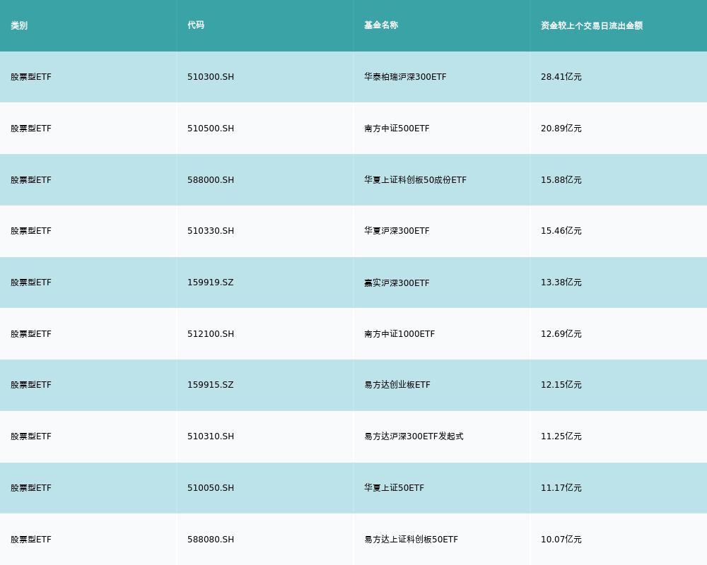昨日股票型ETF资金流出最多的3支ETF及其流入金额分别为:华泰柏瑞沪深300ETF(流出28.41亿元)、南方中证500ETF(流出20.89亿元)、华夏上证科创板50成份ETF(流出15.88亿元)。资金流出前10详情见下表: