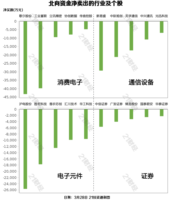 北向资金减持了31个行业,其中消费电子最多,净卖出金额达9.17亿元,其次是通信设备行业,净卖出8.61亿元。