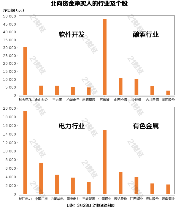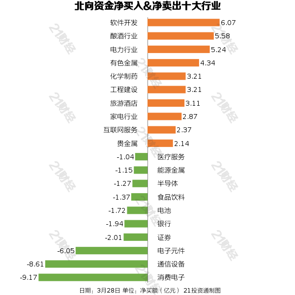 从净买入金额来看,北向资金增持了69个行业,其中软件开发居首,净买入金额达6.07亿元,其次是酿酒行业,净买入5.58亿元。