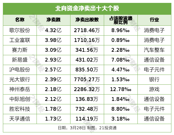 北向资金净卖出歌尔股份(002241.SZ)、工业富联(601138.SH)、赛力斯(601127.SH)、新易盛(300502.SZ)、沪电股份(002463.SZ)居前,其中,歌尔股份被净卖出4.32亿元,工业富联被净卖出3.98亿元,赛力斯被净卖出3.09亿元,新易盛被净卖出2.93亿元,沪电股份被净卖出2.57亿元。