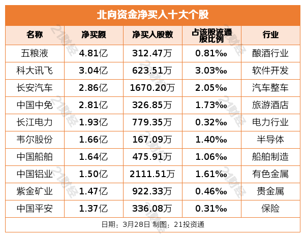 个股方面,北向资金净买入五粮液(000858.SZ)、科大讯飞(002230.SZ)、长安汽车(000625.SZ)、中国中免(601888.SH)、长江电力(600900.SH)居前,其中,五粮液被净买入4.81亿元,科大讯飞被净买入3.04亿元,长安汽车被净买入2.86亿元,中国中免被净买入2.81亿元,长江电力被净买入1.93亿元。