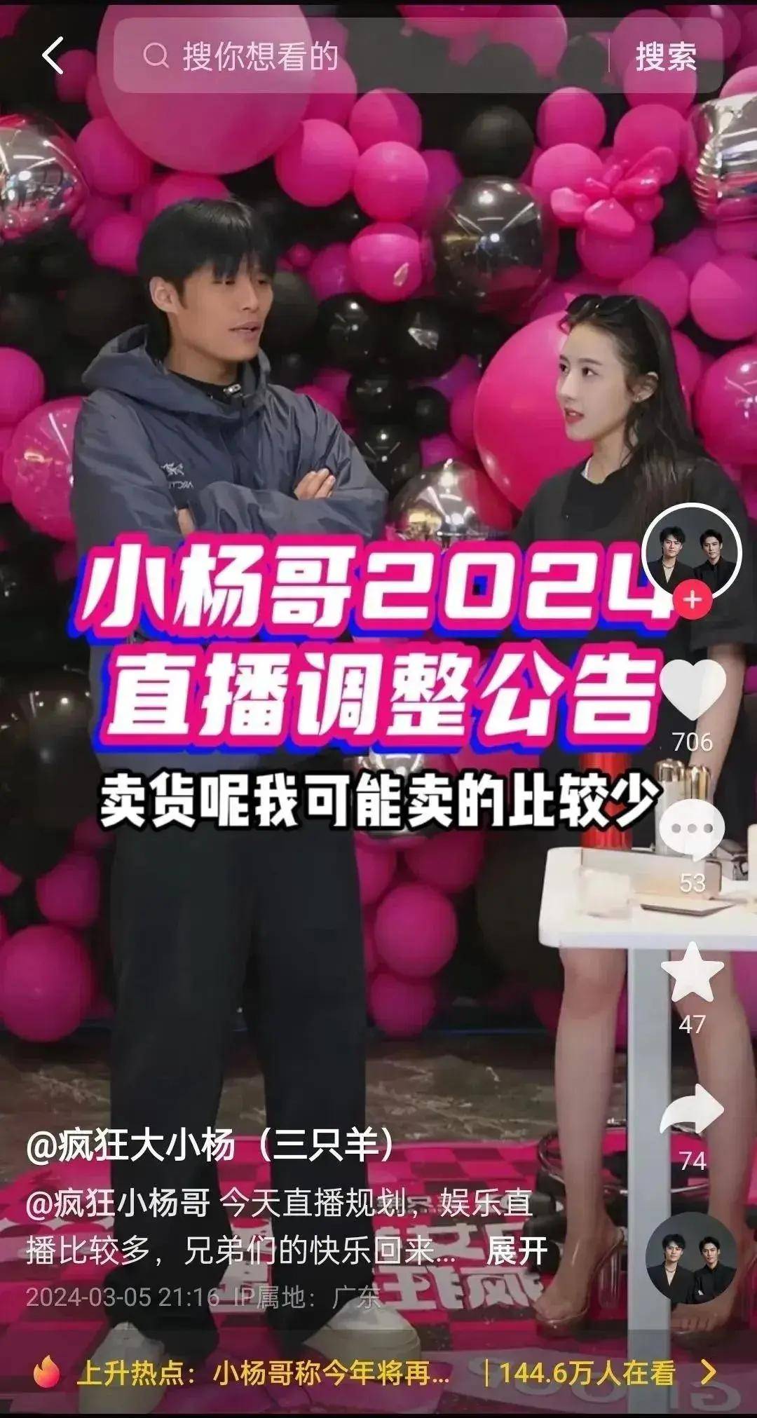 虽然疯狂小杨哥会降低自己的直播带货频次,但并不意味着其粉丝过亿的账号也会就此闲置,据小杨哥自己透露,今年可能会由自己的徒弟接班在其账号中直播。