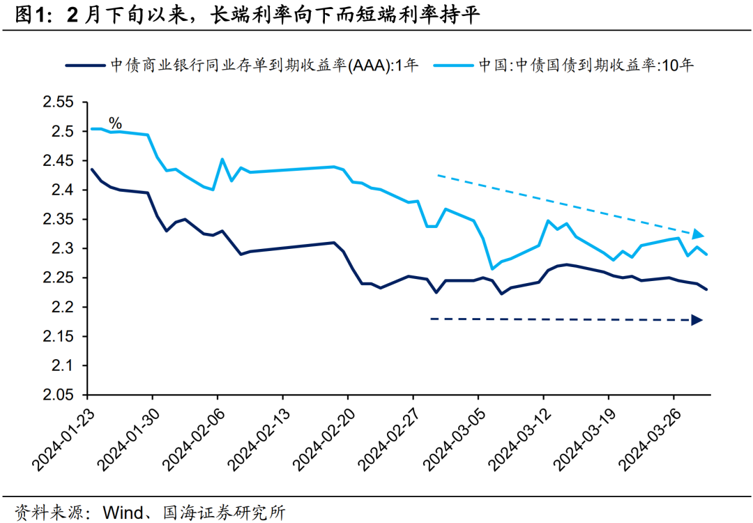 3月份,债市中长端表现整体偏强,然而短端以1Y同业存单为代表的短债利率却并未显著下行,而是呈现窄幅震荡的态势(图1)。