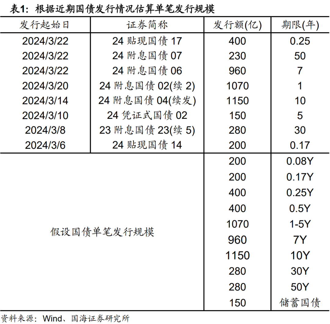 国债方面,在2023年10月29日报告《国债增发,如何影响债市?》中,我们曾分析过国债发行预测方法,主要假设是短时间内同一期限国债的单笔发行规模是连续的(表1)。在此假设下,我们预测2024年4月份国债净偿还规模为2864亿元,净融资环比2024年3月份下行4276亿元。4月份国债净偿还规模较大,主要因为当月国债到期规模较大,高达1.18万亿元。