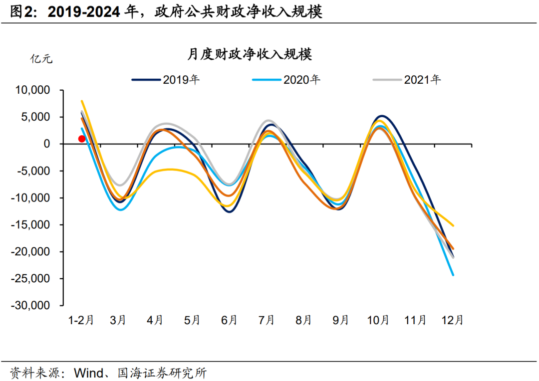 2024年1-2月财政净收入仅为961亿元,明显低于往年同期水平(图2)。我们认为,这一现象或源于2023年四季度增发国债于2024年初下拨,造成财政支出数字偏大,净收入数字偏低。关于政府债务发行与下拨对资金面的影响,我们已经于章节“因素一”中考虑,这一章节主要考虑常规财税征收与下拨对资金面的影响。