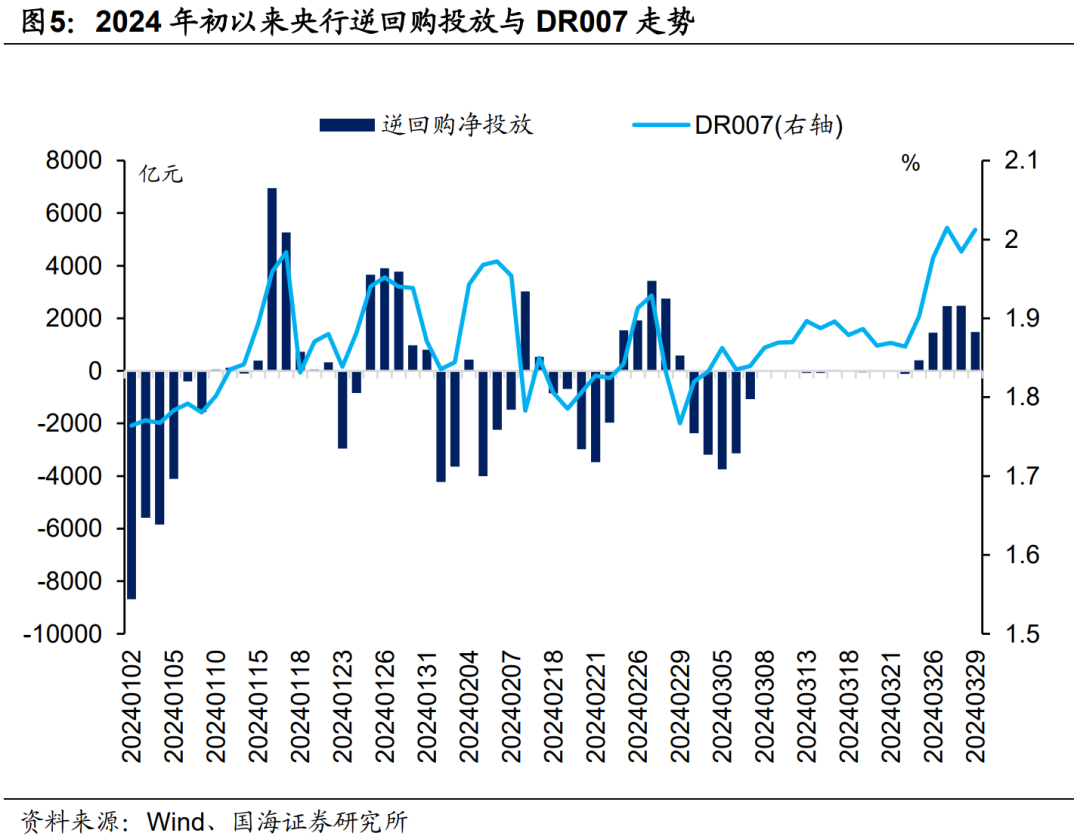 尽管4月份资金面或趋于宽松,但我们仍需考虑央行对于资金面的调控。根据年初以来央行的逆回购投放节奏,我们观察到,当DR007低于1.8%时,央行倾向于回笼逆回购,以维持DR007在逆回购利率以上(图5)。