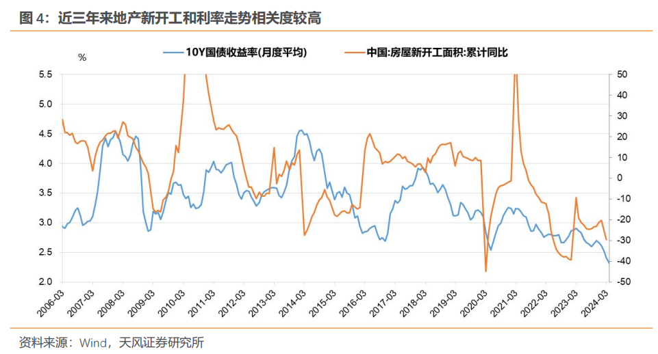 此外,近三年来地产新开工和利率走势相关度较高。当然,新开工增速见底并不一定指向利率回升,同比增速的绝对水平(不能显著低于-10%)和回升斜率都很重要。