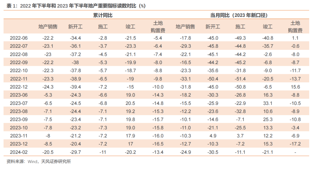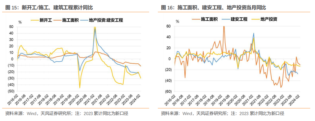 2023年8月底,地产政策边际放松后,9月地产销售出现脉冲式改善,但由于内生需求仍然不足,四季度地产投资、销售增速出现反复。2024年开年,地产投资全线下滑,新开工、施工、竣工对地产投资均有拖累。