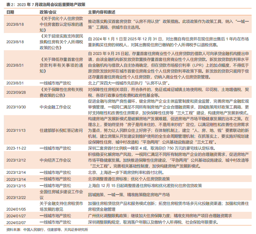 2023年7月政治局会议以来,地产政策逐步加码。8月末地产政策密集出台,包括央行发布调整优化差别化住房信贷政策、下调最低首付比例、降低存量首套住房贷款利率,以及四大一线城市先后明确执行“认房不认贷”、调整限购政策等。