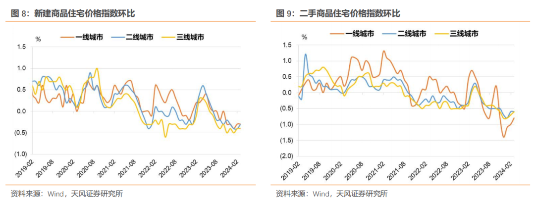 2月70个大中城市新建商品住宅价格一线、二线、三线城市的环比分别为-0.3%、-0.3%、-0.4%;二手住宅价格指数一线、二线、三线城市的环比分别为-0.8%、-0.6%、-0.6%。
