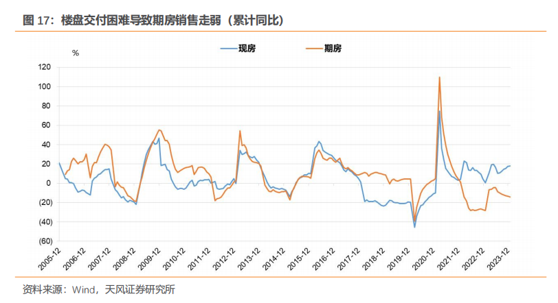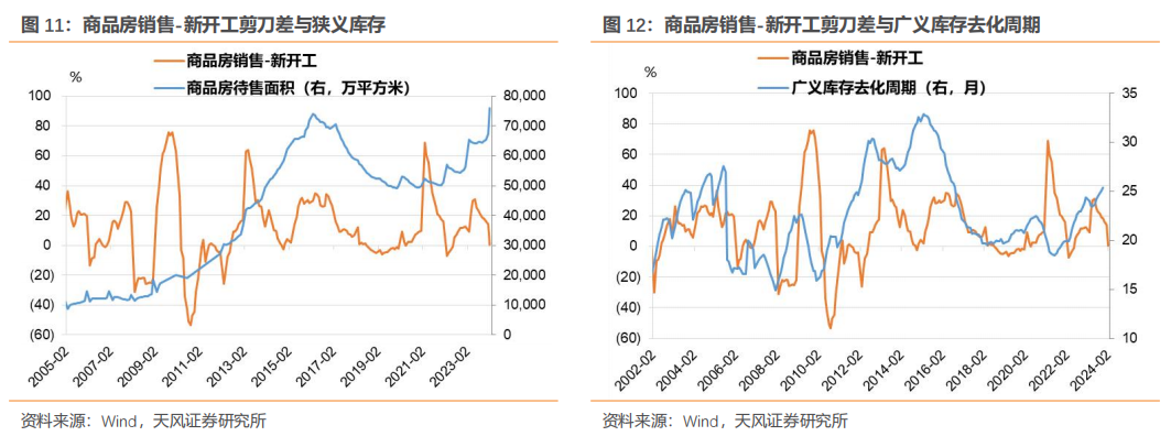 与之对应的是施工面积显著收缩。施工面积类似“蓄水池”概念,竣工强、新开工弱导致施工面积快速下滑。2023年,房屋竣工面积累计同比17%,远好于新开工面积(累计同比-29.7%)和施工面积(累计同比-11%)。