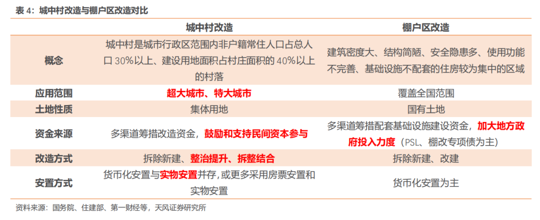 至于各项措施分别对地产有多大的拉动效果,我们认为短期内城中村改造对于地产投资的拉动作用较为确定,其肩负扩大内需、拉动经济和长期改变城乡二元体制、推进城镇化的责任使命。不过与此前的大规模棚改相比,预计城中村改造的拉动效果相对较弱。因为城中村改造的规模和货币化安置力度明显较小,而推进困难程度则更高。
