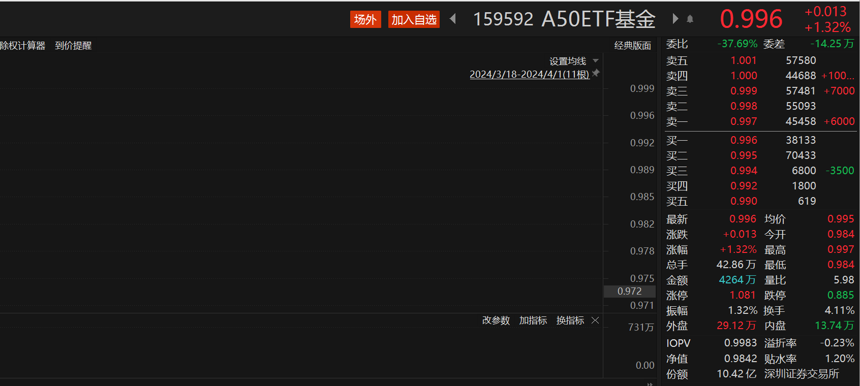 4月1日,三大指数集体高开,中证A50指数(930050)高开快速走强,相关ETF——A50ETF基金(159592)拉升涨超1%,截至发稿,该ETF上涨1.32%,成交额突破4200万元,换手率4.11%,盘中交投活跃。