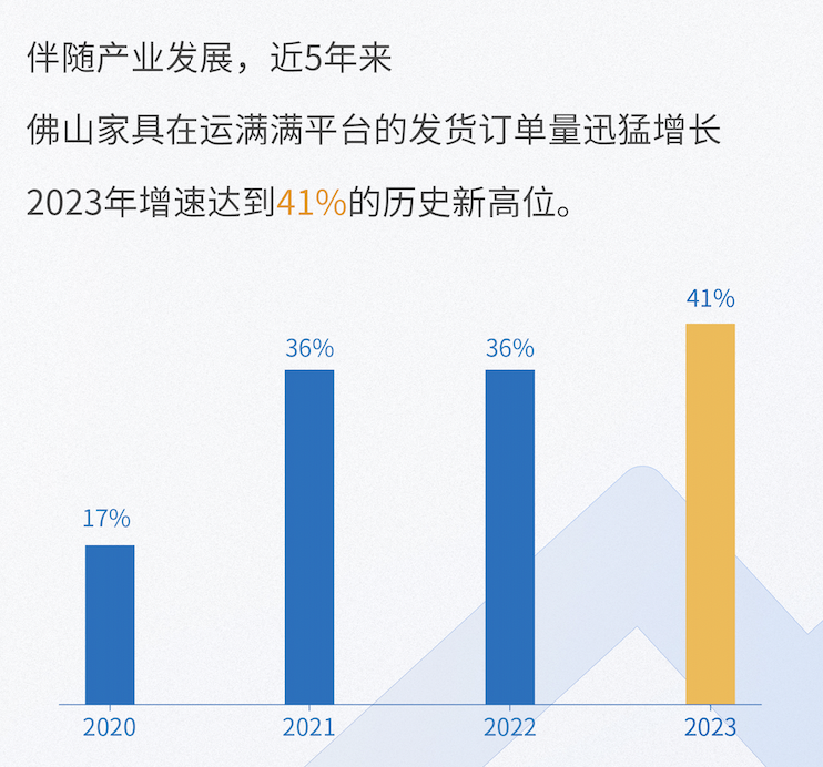 运满满数据显示,近5年来,佛山家具物流的数字化水平提升迅猛。佛山家具2020年平台发货订单量同比增长17%;2021年同比增速翻了一番,飙升至36%;疫情下,2022年不仅没有出现萎缩,甚至实现了2021年超高增速的延续;2023年,平台佛山家具货量实现爆发式增长,增速达到了41%的历史高位。