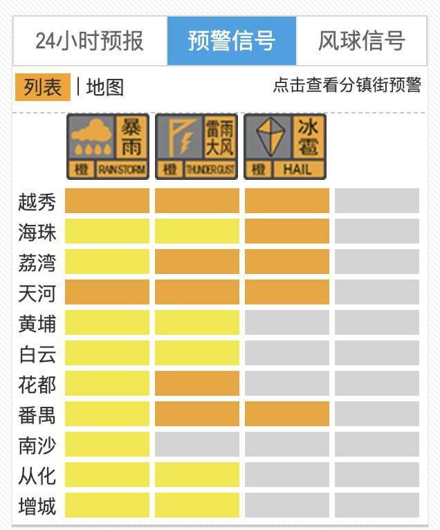 截至9:45,广州多区三大预警信号齐挂,其中,越秀、海珠、荔湾、天河、番禺冰雹橙色预警,越秀、天河暴雨橙色预警,其余8区暴雨黄色预警;除南沙外,10区挂雷雨大风预警,其中,越秀、荔湾、天河、花都、番禺升级至橙色。请注意防御。