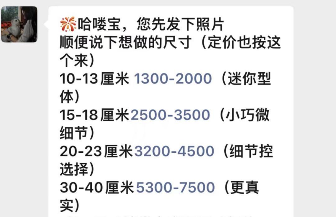 以目前较为流行的宠物仿真毛毡为例。惊蛰研究所在小红书找到一家毛毡手作商家,对方给出的收费标准显示:10-13cm的迷你形体毛毡的价格区间在1300-2000元,30-40cm的毛毡价格最高可达7500元。虽然这个价格看起来并不便宜,但该商家表示目前的订单排期已经排到今年6-7月后,并且要按照付款顺序开始制作。