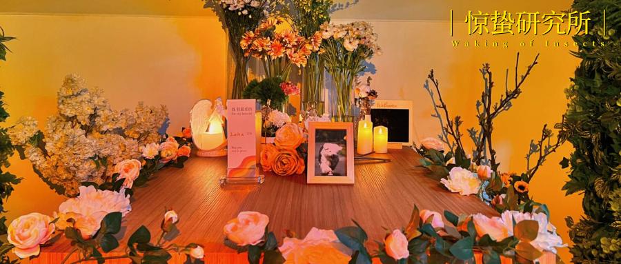 鲜花床、往生毯、纪念墙、爪印纪念盒……在宠物殡葬机构布置的“宠物追思会”现场,一场体面的告别仪式就这样进行了。